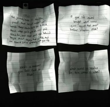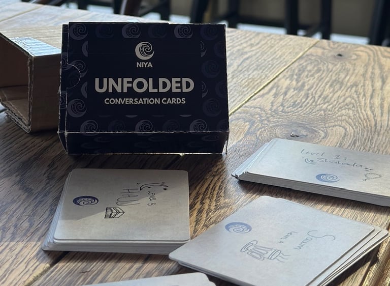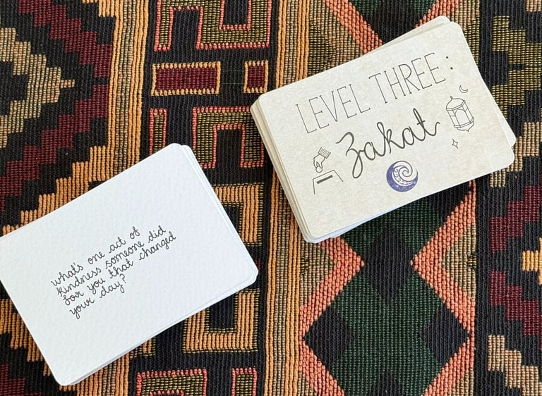 unfolded is a card game designed to spark meaningful conversations. The cards start light, then slowly deepen towards vulnerability and reflection. Inspired by the layered nature of Islamic growth, the cards move through five progressive levels, mirroring the structure of the five pillars of Islam.