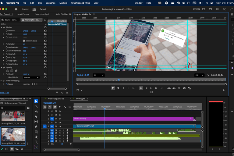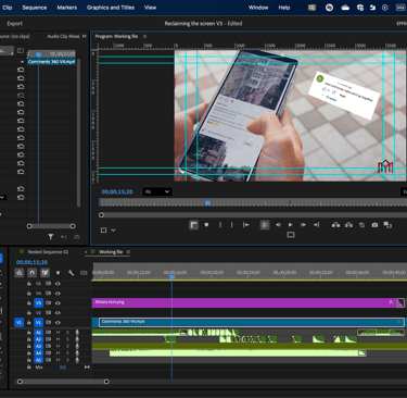 For the ending, the original plan was to show the Minara Media icon on the phone, but this shot wasn’t filmed. Instead, I problem-solved by reversing the final clip to zoom in rather than zoom out, and used opacity keyframes to make the comments glitch and flicker away. I then duplicated and cleaned up the clip to show a clear frame before slowing down the final second, where the subject lifts his gaze.